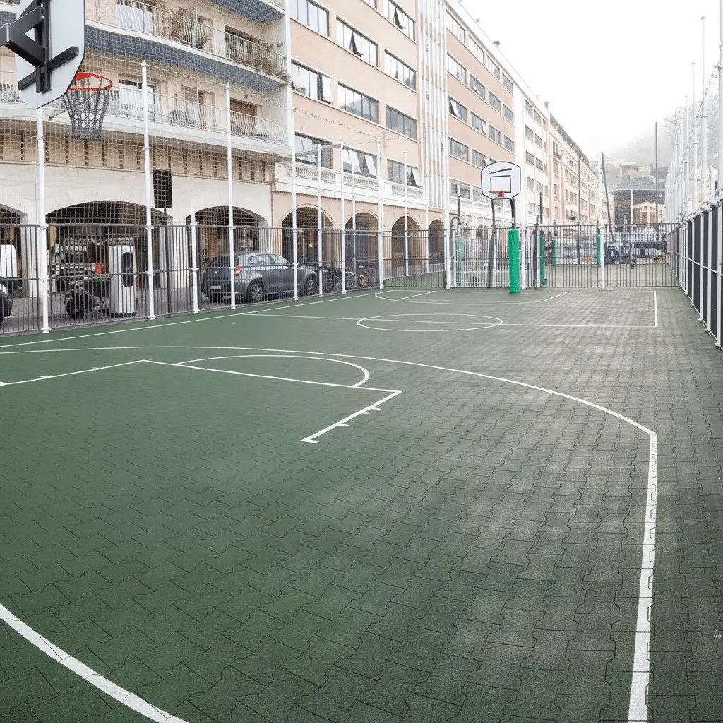 Dalle amortissante emboîtable en caoutchouc avec système puzzle. Pose rapide sans outillage, idéale pour l’événementiel, les terrasses, zones temporaires ou espaces extérieurs sécurisés.